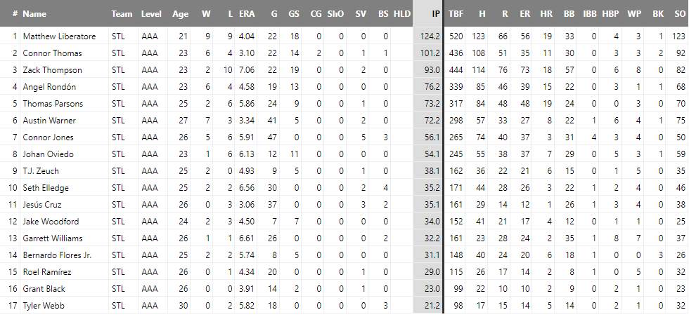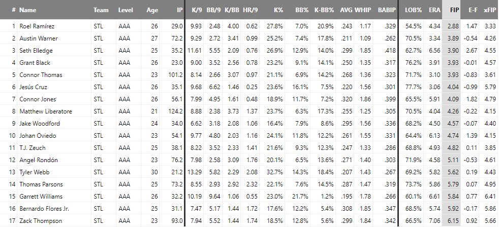 한마디로 깜짝활약. top30 유망주 리스트에도 들지 못한 선수가 이런 성적을 거둘 것이라고 누가 생각했겠는가? 구속이 빠르진 않지만 수준급 제구와 땅볼 유도 능력으로 당당히 Memphis 로테이션 한 자리를 차지해냈다. 특히 땅볼/뜬공 수치가 2.3을 넘어서는 것은 내야 수비가 리그 탑급인 빅리그 Cards와의 상성도 맞음을 증명하고 있는 것임에 다름없다.