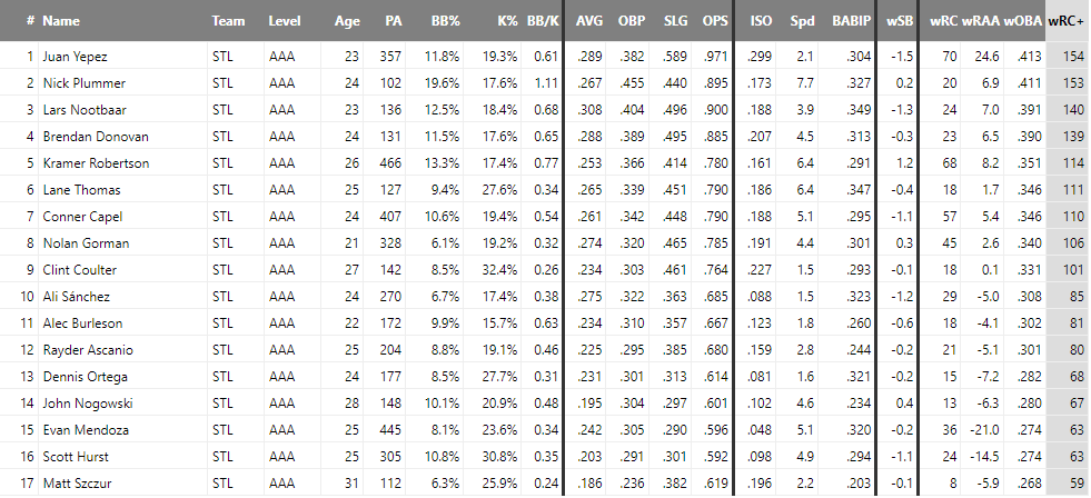 Memphis Redbirds (AAA) : 35G 117타수 6홈런 21득점 19타점 17볼넷 25삼진 / 타출장 .308 .404 .496 / OPS .900