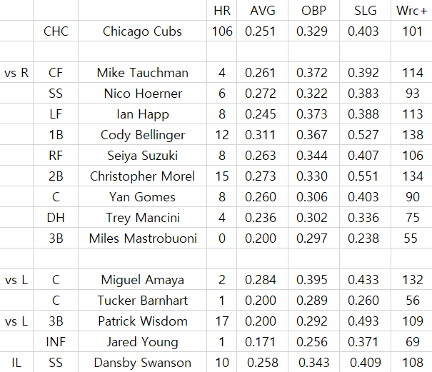 타선은 한화에서 재계약 불가 통보 받은 것이 오히려 전화위복이 됐던 터크먼, 부활을 꿈꾸고 1년계약을 맺은 벨린저, 그리고 깜짝 등장한 모렐 셋이 이끌어나가는 중이라 볼 수 있다. 햅, 스완슨, 호너는 못하진 않지만 돈을 생각하면 영 부족하고, 위즈덤은 타율이 간신히 2할 턱걸이하는 공갈포이다. 그러나 절대 만만한 타선이 아니고 부시가 아닌 리글리 필드이기에 항상 조심, 또 조심해야 할 것.
