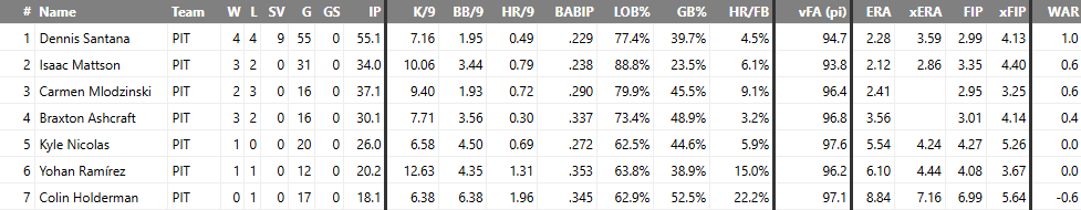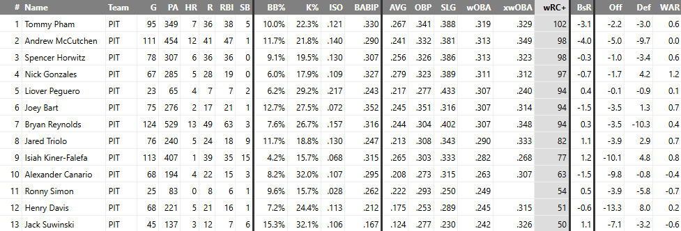 이 팀도 심각하긴 한데 옆집에 비하면 천하다. wRC+가 100을 넘기는게 마이콜과 동갑내기인 토미팸이라니...이 팀이 스킨스를 데리고 왜 지구 최하위에 꽂혀있는지 알 것도 같다. 다만 8월 한 달만 기준으로 삼으면 상황이 조금 달라지는데, 트리올로-레이놀즈-바트-맥커친-호르위츠 등이 wRC+ 120을 넘기고 있으며, 이들이 도합 11개의 홈런을 8월 한 달에만 기록중이다.