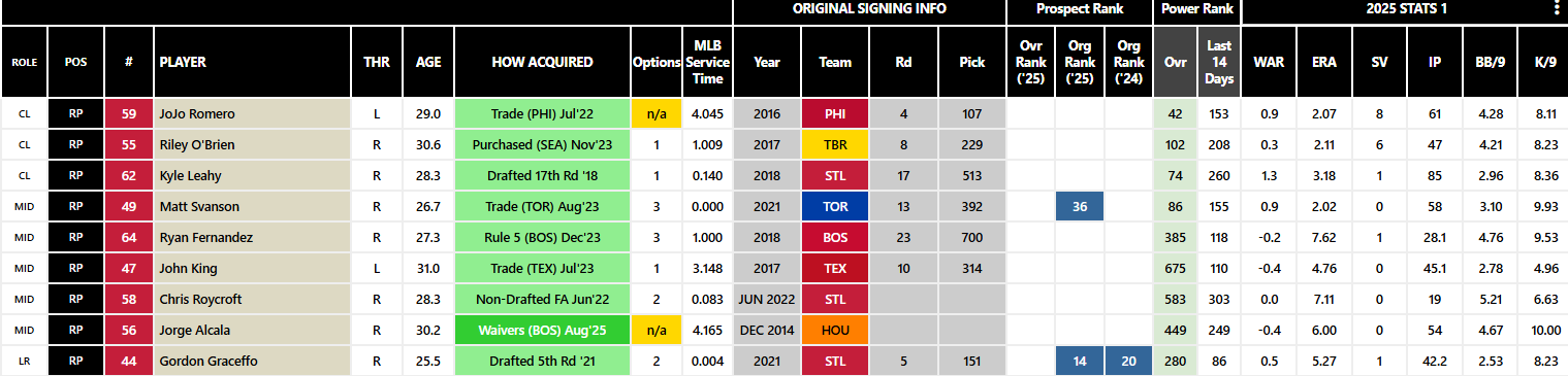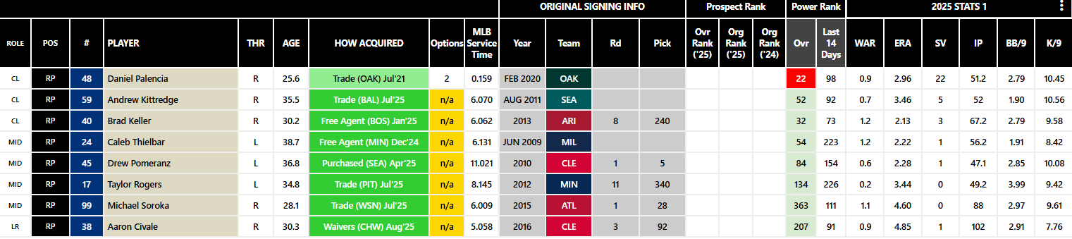 놀라운 수준으로 탈바꿈한 Cubs 불펜진은 현재 로스터에 있는 8명 중 7명이 지난해엔 없었던 선수들이고 마무리 Palencia는 지난해까지 5.02ERA에 불과했던 평범한 투수였다. Pomeranz나 Civale 등 줍줍에 성공했고 트레이드로 알뜰하게 채워넣었다.
