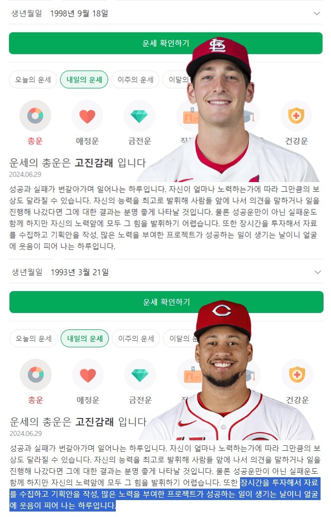 제가 방금 네이버 사주에 두 선수의 내일 운세를 문의해 본 결과!!!! 몬타스와 팔란테 두 명 모두 2차전이 시작되는 날의 운세가 '고진감래'로 성공과 실패가 번갈아 일어난다고 합니다. 사주가 '엄대엄'이 떠버렸으니 최근 경기 피칭이 어쩌니 세이버 메트릭스 지표가 저쩌니 하는 이야기는 전부 아무 소용이 없겠죠? 2차전 역시 팽팽한 투수전 혹은 두 선수 모두 조기강판 되는 흐름을 예상해 봅니다!