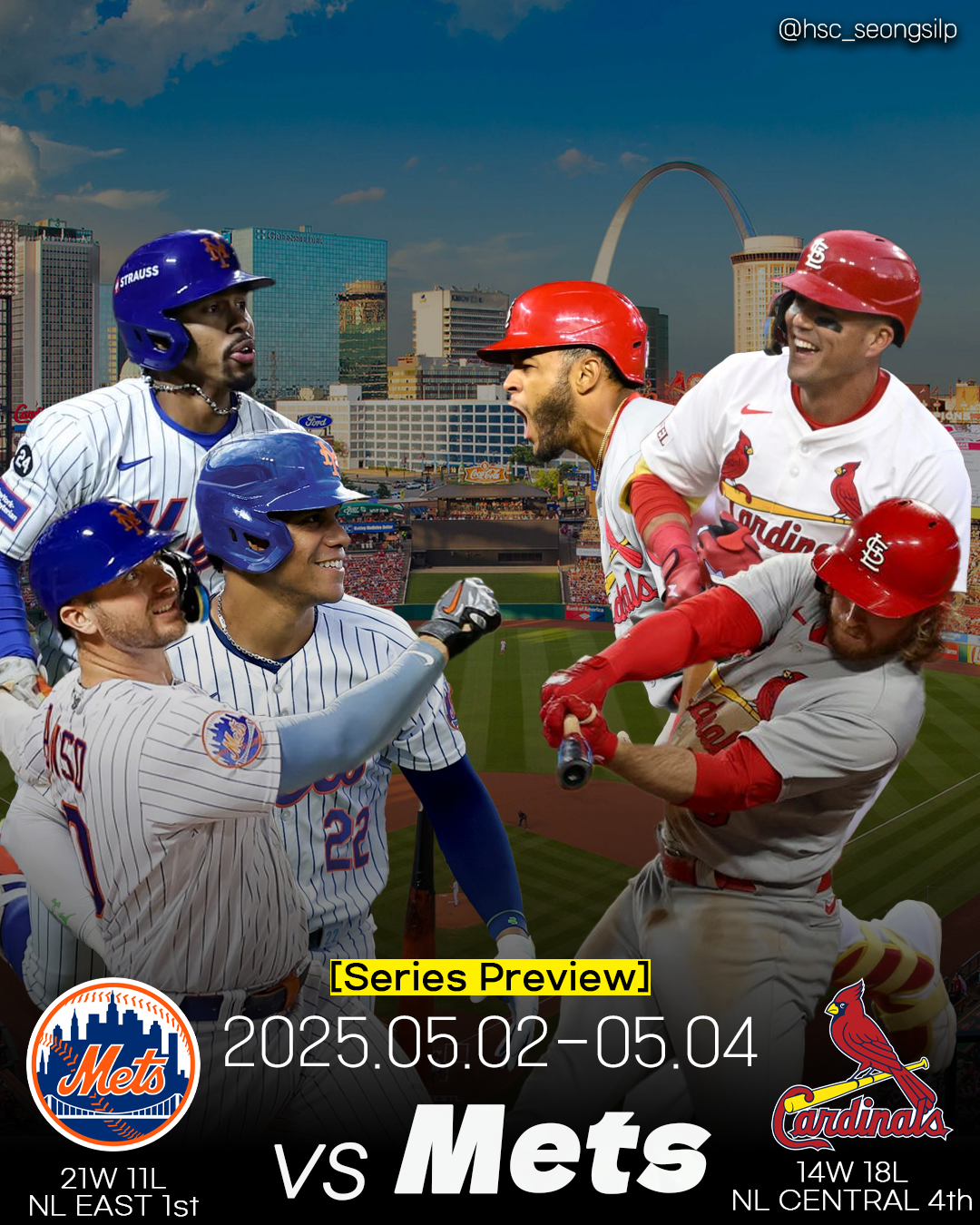 '선발 에이스에 도전하는 불펜 에이스' 카일 리히가 시리즈 1차전 선발투수를 맡습니다! 2018 드래프트 17라운드에서 카디널스의 지명을 받았던 리히는 전체 513위의 지명 순번이 보여주듯 큰 주목을 받던 유망주는 아니었습니다. 그런데 데뷔 7년차였던 2024년부터 괄목할 만한 성장세를 보이며 빅리그 주전으로 자리잡는 데 성공했고, 지난해에는 팀에서 두 번째로 많은 경기에 등판해 불펜 투수 중 가장 많은 이닝을 소화하는 등 계투진의 에이스로 맹활약했습니다! 스프링 트레이닝에서는 5경기 모두 선발 등판하여 17.2이닝 20탈삼진으로 위력적인 구위를 뽐냈습니다. 맞대결하는 메츠의 선발투수 클레이 홈즈는 지난해 선발 전향을 시도했으나 시즌 후반 부진하며 로테이션에서 탈락한 바 있습니다. 올해는 선발투수로서 소포모어 징크스의 가능성이 있기에 리히의 우세가 예상됩니다!