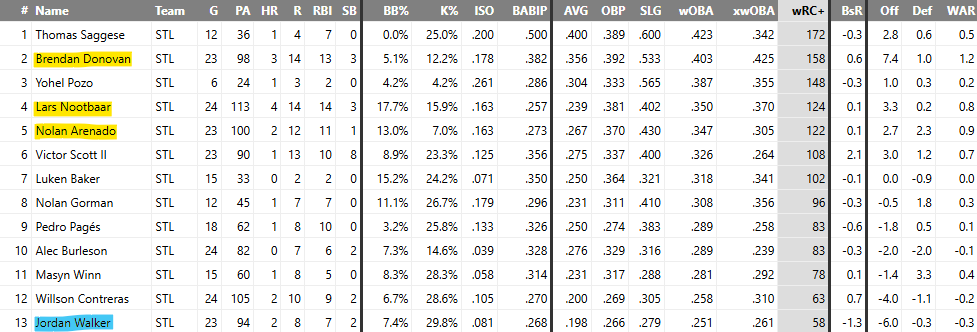 Cardinals 23승 26패 .469 (NL Central 3위) Run Diff. -43