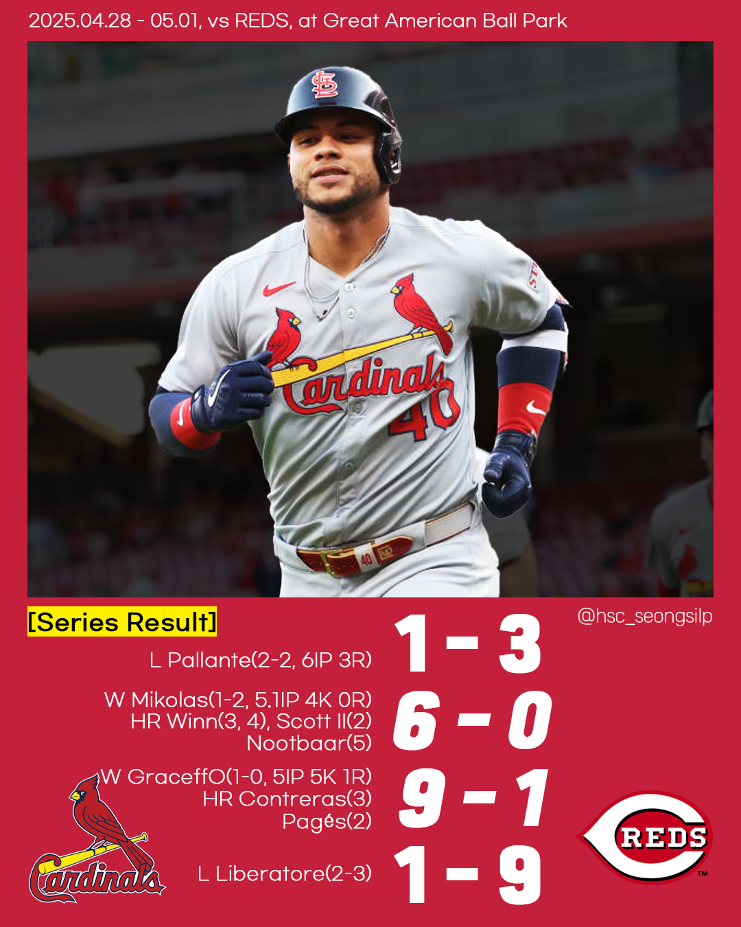 리빌딩 팀에 있어 가장 중요한 것은 '기세'입니다. 젊은 유망주들은 기세를 탔을 때 제3자가 기대하는 잠재력을 훨씬 뛰어넘는 활약을 펼치지만, 분위기가 안 좋을 때는 제 실력의 절반도 발휘하지 못하며 끊임없이 부진하기 때문입니다. 이런 점에서 봤을 때, 젊은 선수들의 저력을 믿고 이들을 메인으로 구상하며 시즌을 구상한 레즈는 현재 상승세 이전의 단계에 위치해 있다고도 볼 수 있겠습니다. 레즈는 현재 4연속 루징 시리즈의 수렁에 빠져 있습니다. 따라서 카디널스가 보다 수월하게 4연전을 풀어나갈 수 있을 것으로 여겨집니다!